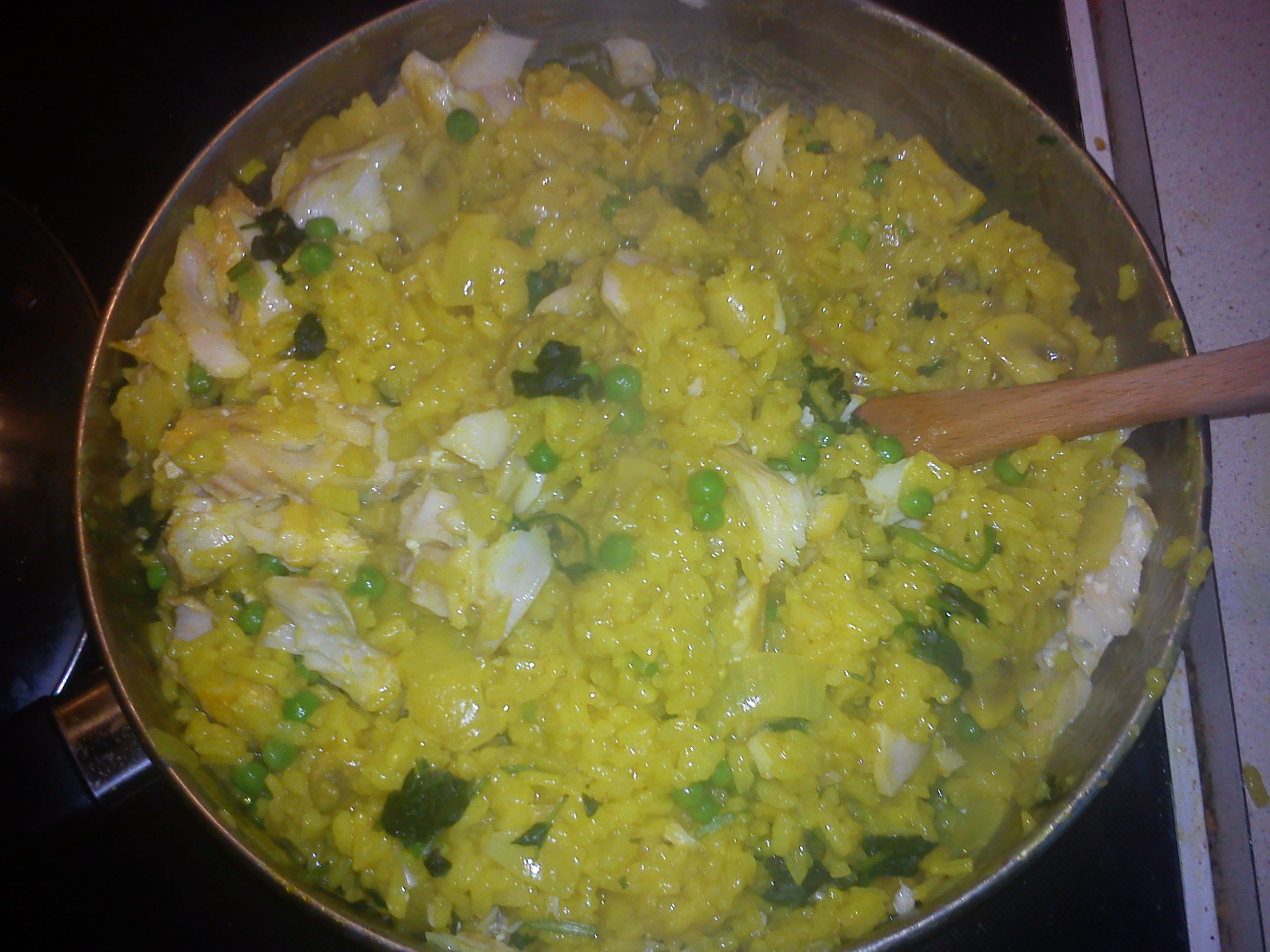 In a separate pan place your haddock and enough milk to about half cover it. Heat gently until the milk is just simmering and cook through. This will be 3-4 minutes for fresh fish, 8-10 for frozen. Take the fish out, remove the skin and press the flesh into loose flakes with a fork. DO NOT CHOP IT! Now get yet another pan on with some water to bring to the boil for your eggs. Keep an eye on the rice, stir if you feel the need. After about 20 minutes the rice will start to get to an al dente (firm but edible) point. It is now you should add the flaked fish and frozen peas, stir it all very well then cover, cook for another minute then turn off the heat.