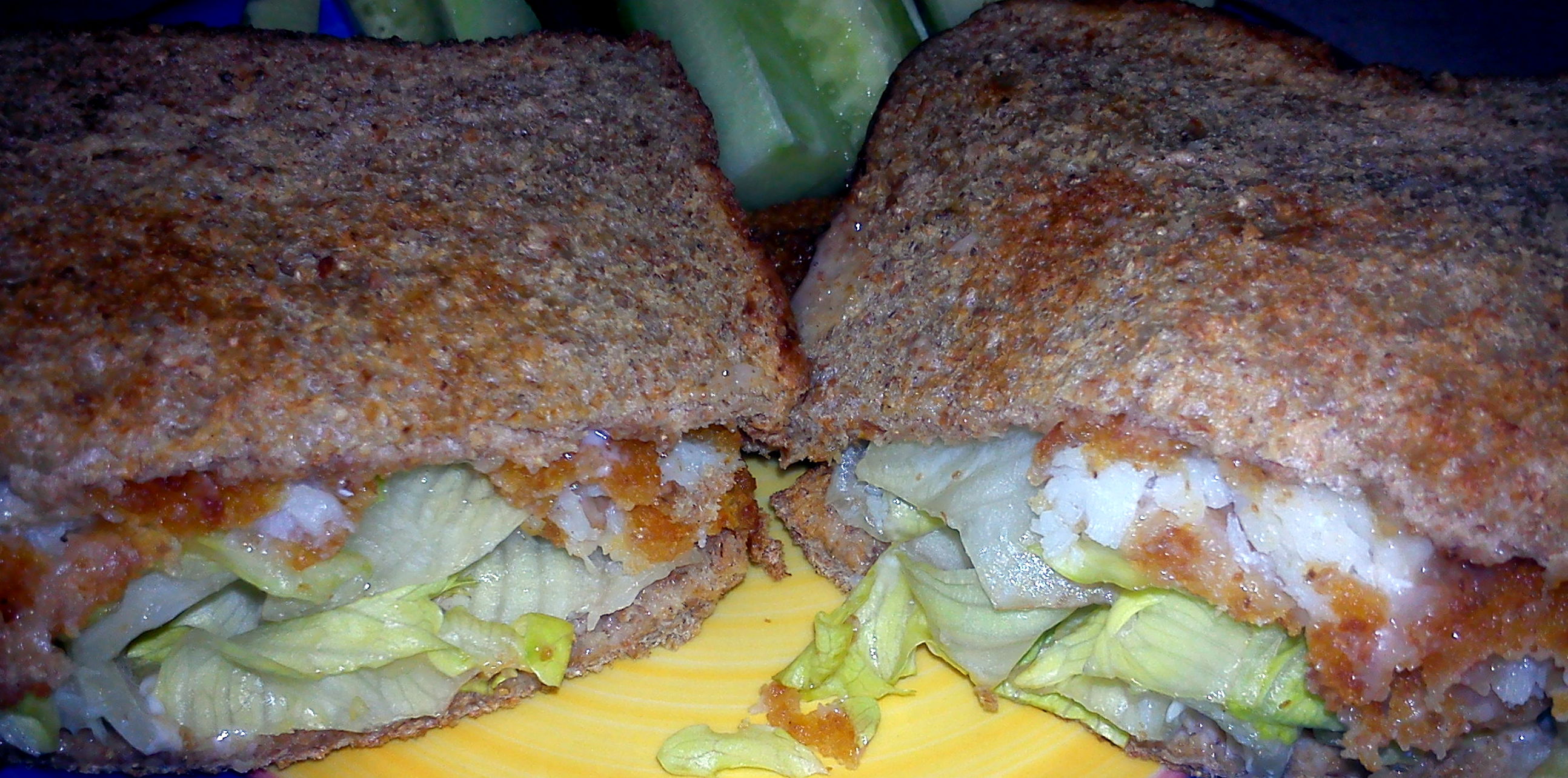 The Sandwich: Four of Birds Eye’s finest fish fingers, served on toasted Hovis Wholemeal with a light smear of half fat mayo and iceberg lettuce. And a side of cucumber sticks. Yes, cucumber sticks. I’d like to take this opportunity to mention to Hovis, if they are reading, that their sliced bread SUCKS for sandwiches, even toasted it’s too skinny and weak to stay together around anything more substantial than a scraping of flora light. Rubbish.