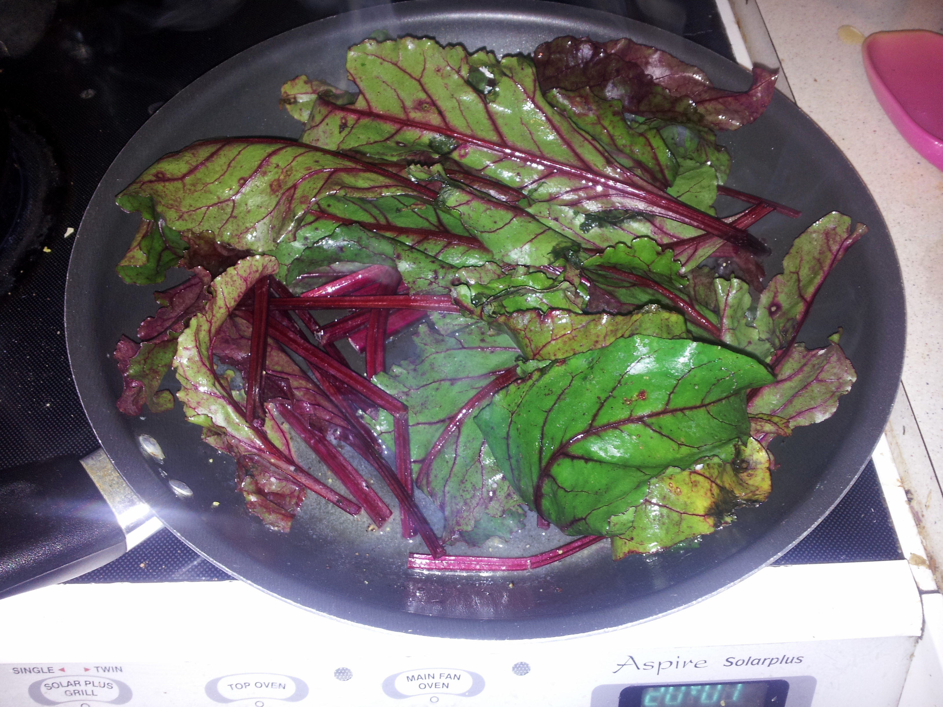 A quick stop to google reassured me that eating these purple streaked greens would not kill me and would impart most of the dietary benefits of their cousin spinach. Waste not want not, so into the pan.