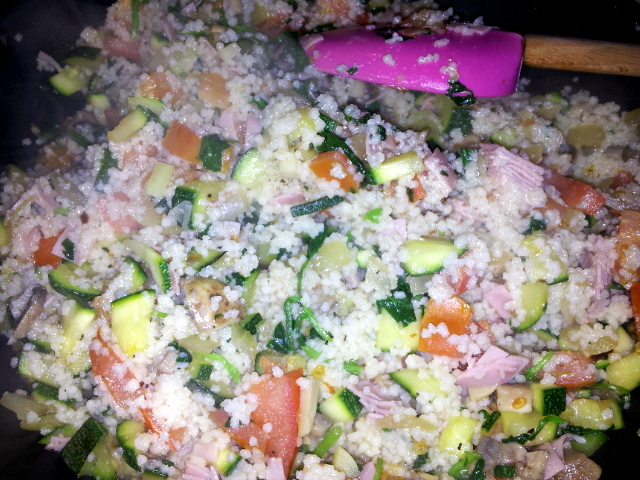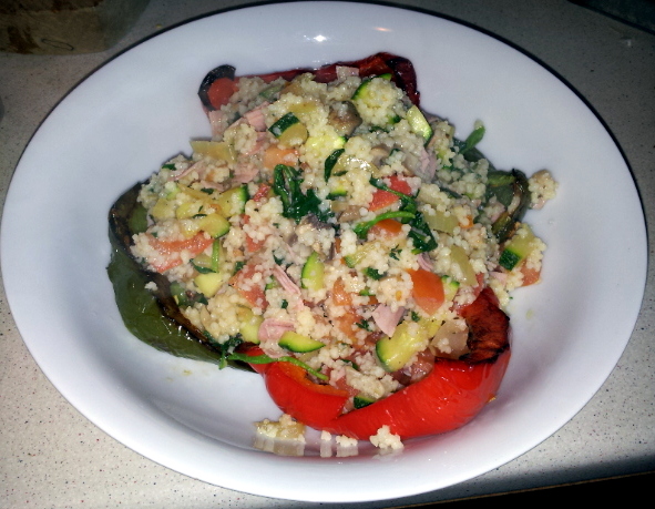 When the peppers are ready, leave in the oven until serving but turn the oven heat out. Turn said heat back up under the pan and add the couscous, stirring thoroughly but gently, otherwise you will cover your nice clean kitchen in little bits of dinner