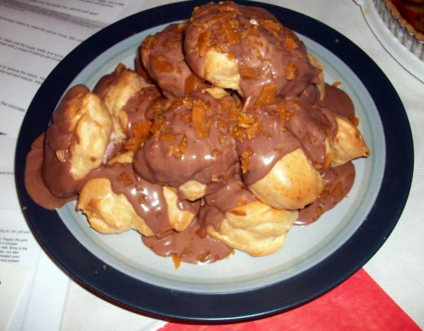 My second joint winner of the night from Tom, and not just because he had the confidence/balls to serve a cake that really did fall out of the tin in bits. I once made a cake that did this and was so mortified by the results that I gave the broken cake to my neighbour who I don’t like and made another one. Well done Tom for being rather more sensible and less vain that I am. And double well done for putting together a really tasty, moist, golden apple cake which I really could have polished off without any help at all. Top notch.Matt came up with these lovely profiteroles filled with a strikingly coloured and wonderfully sharp blackberry cream and devilish toffee shards to garnish. A great take on a classic.Unarguably beautiful effort from Stuart- a perfectly presented fruit tart. Great texture from a buttery shotbread base, topped with a rummy custard then immaculately finished with sliced soft fruits. Marvellous.