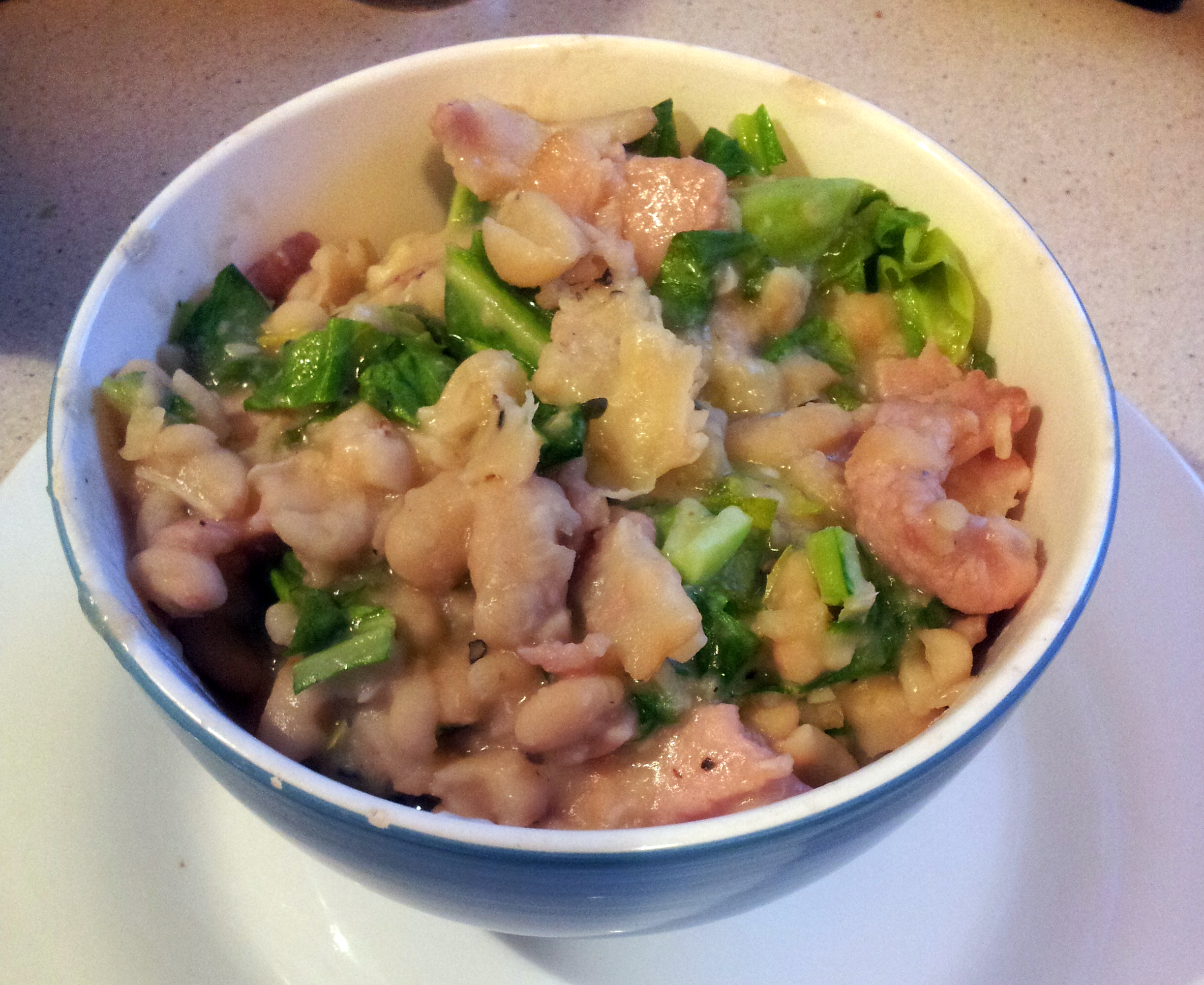To start, roughly chop up your bacon- if you’re keeping the fat on then put this straight into a hot pan with nothing else or if you have trimmed it you will need a smidge of olive oil to avoid it sticking. Add in your garlic, minced or chopped (I like 2 fat cloves per serving) and cook for a couple of minutes until the bacon is opaque but not quite done. Add your chilli now you can use fresh or dried just go with your own personal heat preference. Next add your beans- there’s very little liquid in the ones I get so I don’t drain them. You may or may not wish to add a little bit of water. Cover, turn the heat down and leave to cook for another five minutes with the odd stir to avoid the beans welding themselves to the pan base. While this is going on finely shred your cabbage, then when the beans are just starting to look a bit mushy round the edges throw it in the mix, stir gently but thoroughly then cover again and cook for a further 2-3 minutes until the cabbage is cooked through.