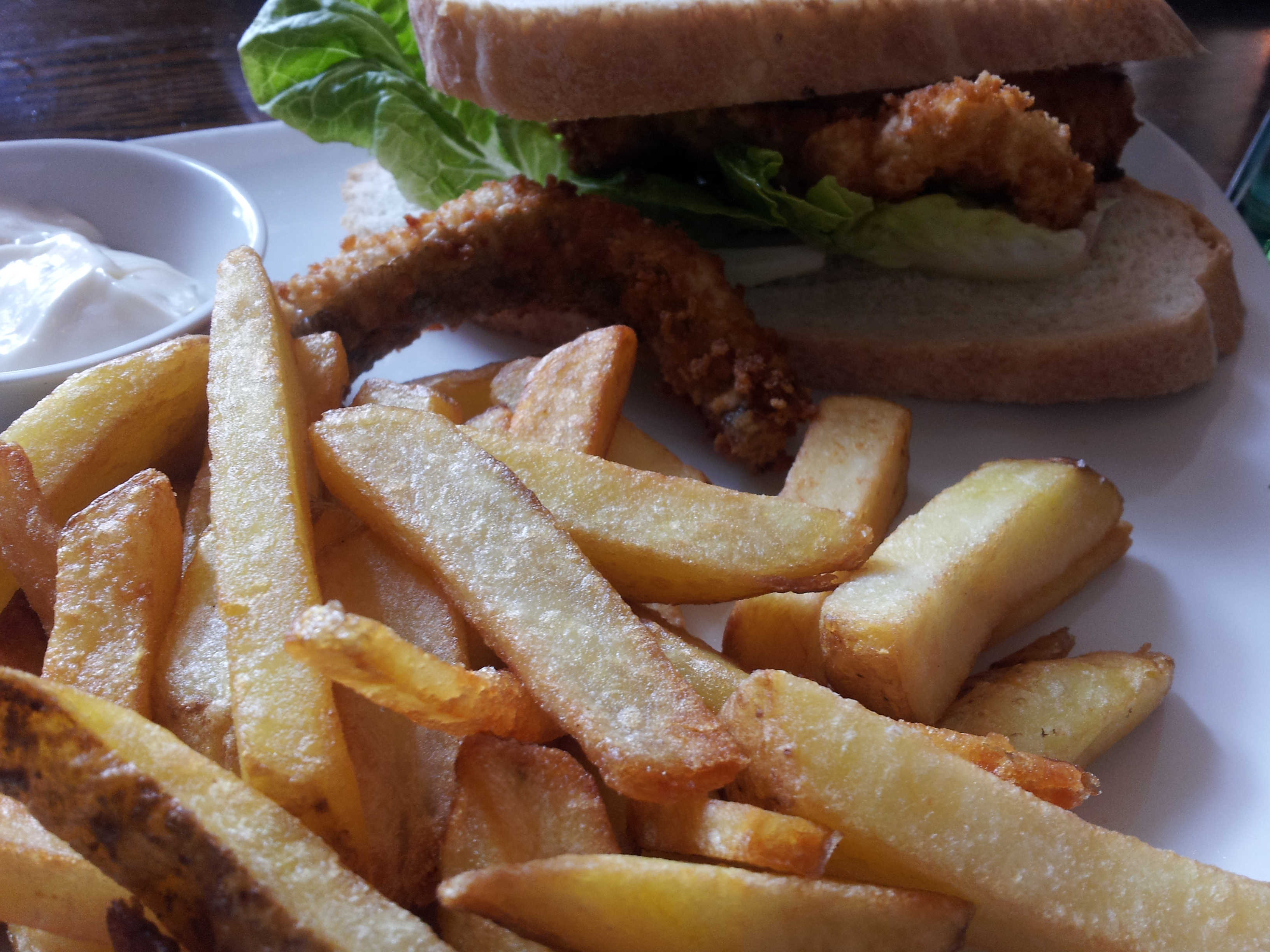 I have to say, it looked pretty bloody marvellous: crispy fried haddock goujons and fresh lettuce served in some kind of artisan type bread, basil and lime mayo on the side for optional bread smearing and the skin on chips that are always a winner at this particular establishment. Beautifully turned out, the proverbial first bite as taken by the eye was most satisfying indeed. And something of a false promise it turned out, because the first bite with my actual eating bits was disappointingly flat. The bread was dense and white, the goujons were hot and crunchy on the outside, softly fleshy on the inside. The lettuce was fresh and crisp and made a satisfying snap as bitten into. The lime basil mayo didn’t taste of lime or mayo. This my friends was a precision exercise in presentation and texture but sadly forlorn when it came to flavour.