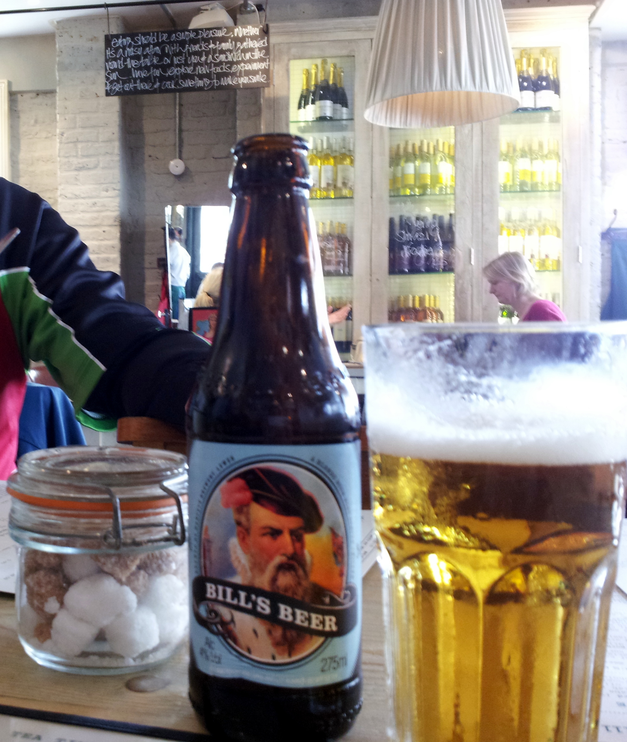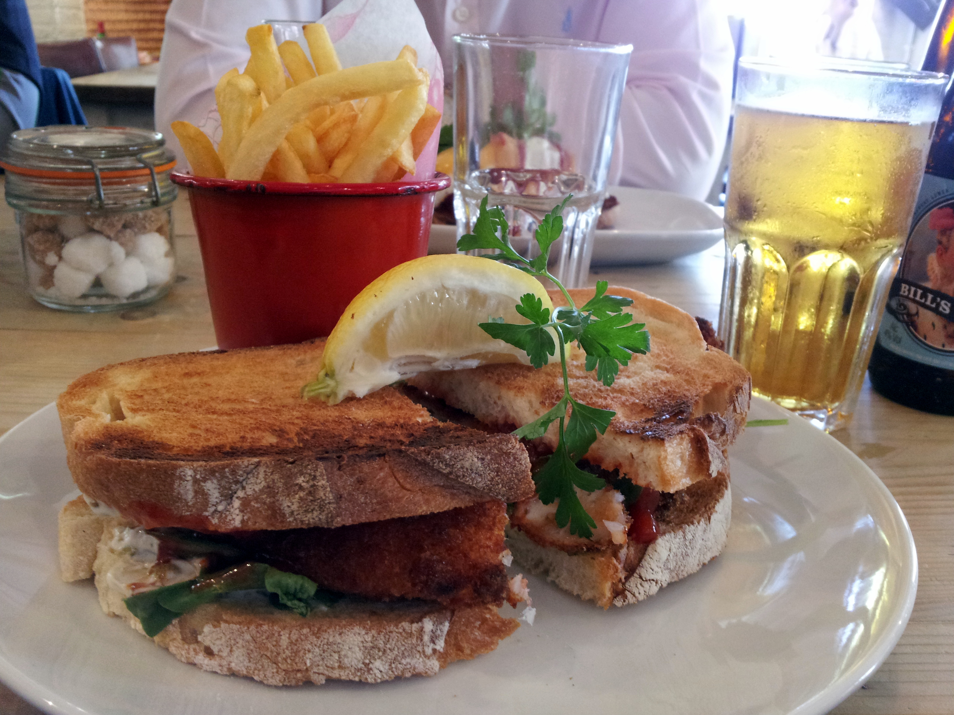 Anyway it was just getting busy as we arrived and the boys all had their eyes on one of the breakfast dishes (served until 1 on the weekends to accommodate that B word crowd). I must say it all looked very tempting, especially the eggs florentine and/or benedict. For a moment I was almost swayed by a mackerel MLT special which looked very special indeed but in my heart of hearts, almost everything on the menu was a non-starter. It’s Bill’s. You have a bloody mary and a fishfinger sandwich at Bill’s. At least I always have in the past, however a pre order trip to the loo meant returning to a Bill’s beer, as selected by my father and what a good call that was. I don’t know much about beer, I know what I like and that is reasonably limited but Bill’s Beer in a frozen glass gets a big thumbs up from me.