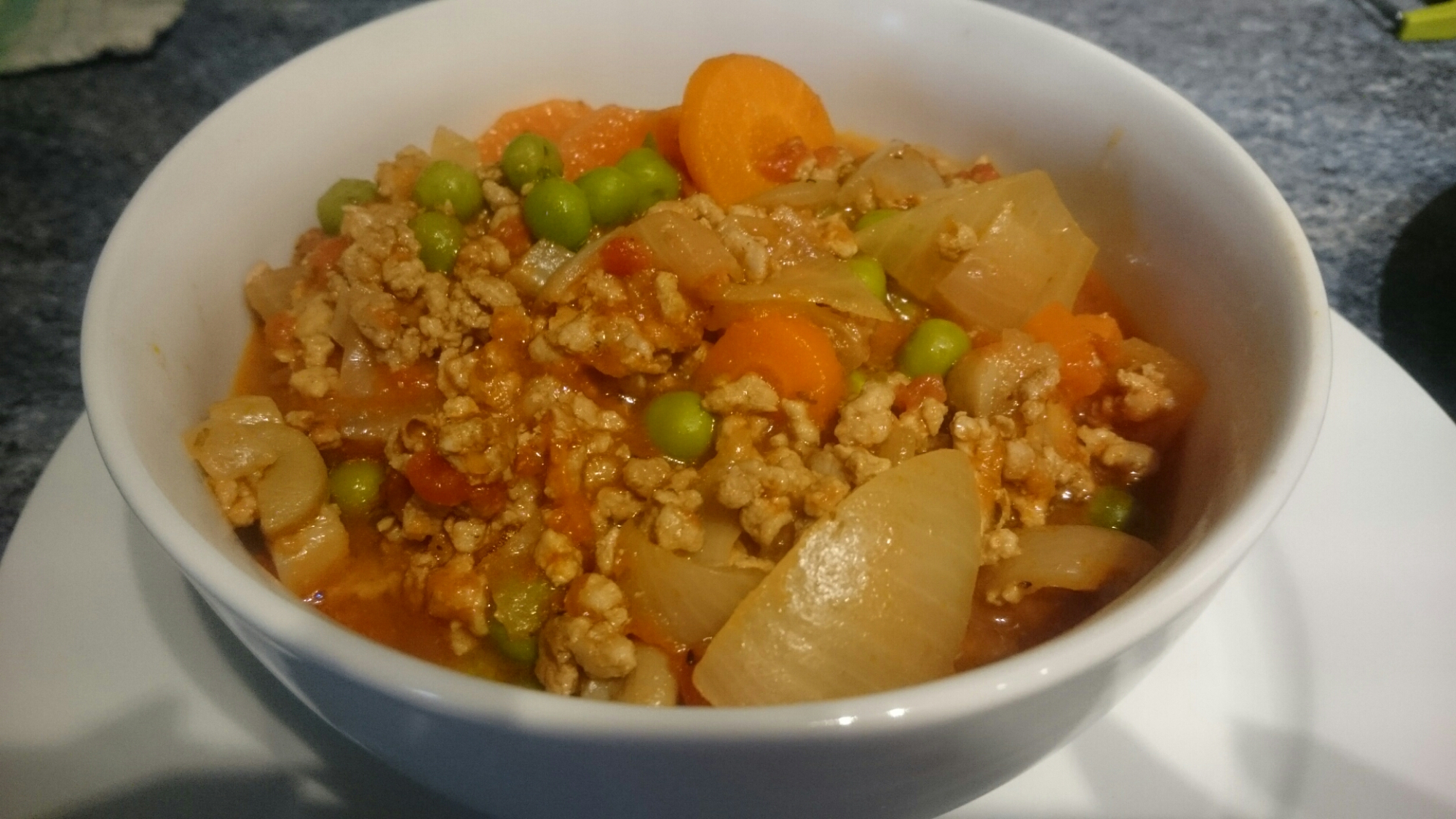 Cover, turn the heat down and allow to simmer for ten minutes. Add the frozen peas and carrots if using plus a Tbspn cider vinegar, bring back to simmer for another two minutes, done.