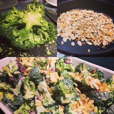 Closer to dinner time wash the broccoli and pat dry. Please use a fresh, good quality broccoli that is firm and very green. If you can go organic all the better. Slice them down into bite sized bits with a good sharp knife, stir in the cranberries then toss in the dressing. Keep in the fridge until you are ready to eat then scatter the toasted almonds over the top just before serving.