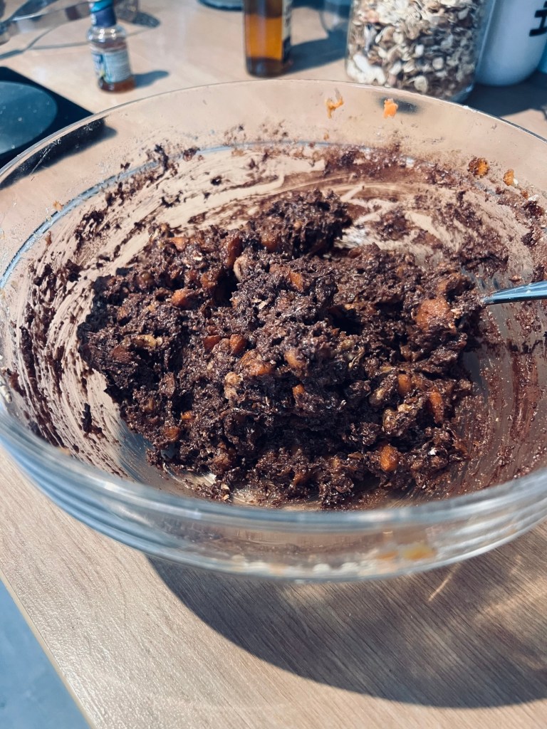I made the brownies. I smushed the sweet potato and sifted the cocoa and felt endlessly self righteous with the agave syrup. I giggled like a cartoon villain at the oat flour cheat. I mixed up the claggy, sticky mess and baked it for half an hour at 180. I let it cool a little and that first, still warm slice had a promisingly fudgy middle despite not crisping at all on top (lack of butter and real sugar?).