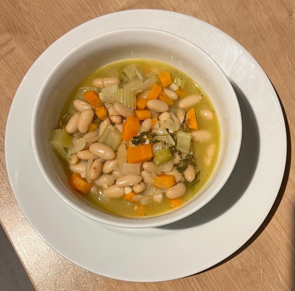 When it comes to serving, you have a lot of options here. You can just go with a lovely bowl of beany stew, yummo. But as it’s Saturday night you might want to add in a bit more substance. As a minimum, you wont be surprised to hear me say you should add some crusty bread and a nice glass of wine. I prefer this with a couple of sausages on top but you could also go for some pork belly or a bacon steak even some chicken if you wish. Veggies might throw on top a mix of (butter) fried or roasted mushrooms- shitakes would work. Some tenderstem broccoli or a simple green salad on the side will be a welcome boost of nutrition.